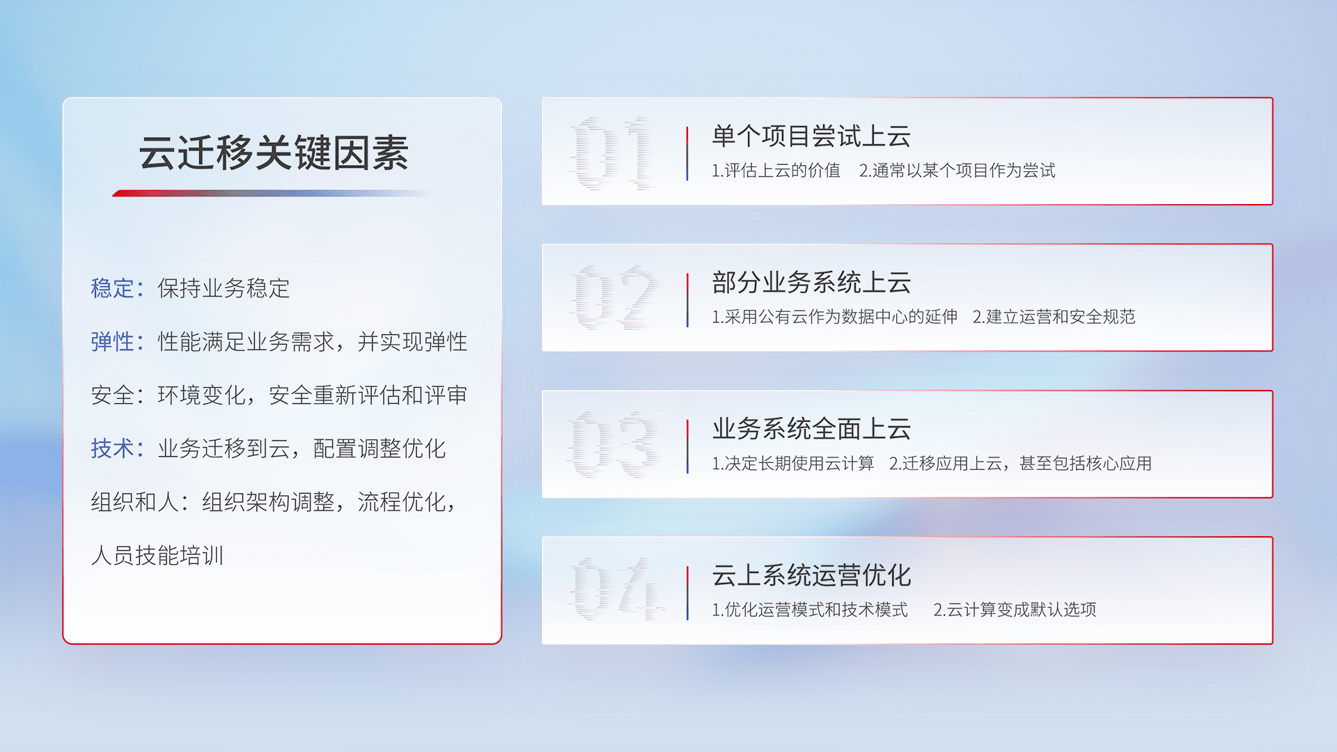 结合实际业务,,,,从规划设计、、云平台选型、、、云原生改造、、数据迁移、、、、集成交付,,,,迁移全过程为客户识别最佳上云路径,,,,做好风险识别管理,,,设计网络架构、、、身份权限、、安全审计合规、、、、操作审计、、、日志审计、、、监控告警策略、、、、多站点容灾设计等,,,,对云上基础设施进行整体规划,,,,提升IT治理水平,,,,以满足弹性、、、高可用、、、、高性能的需求。。
