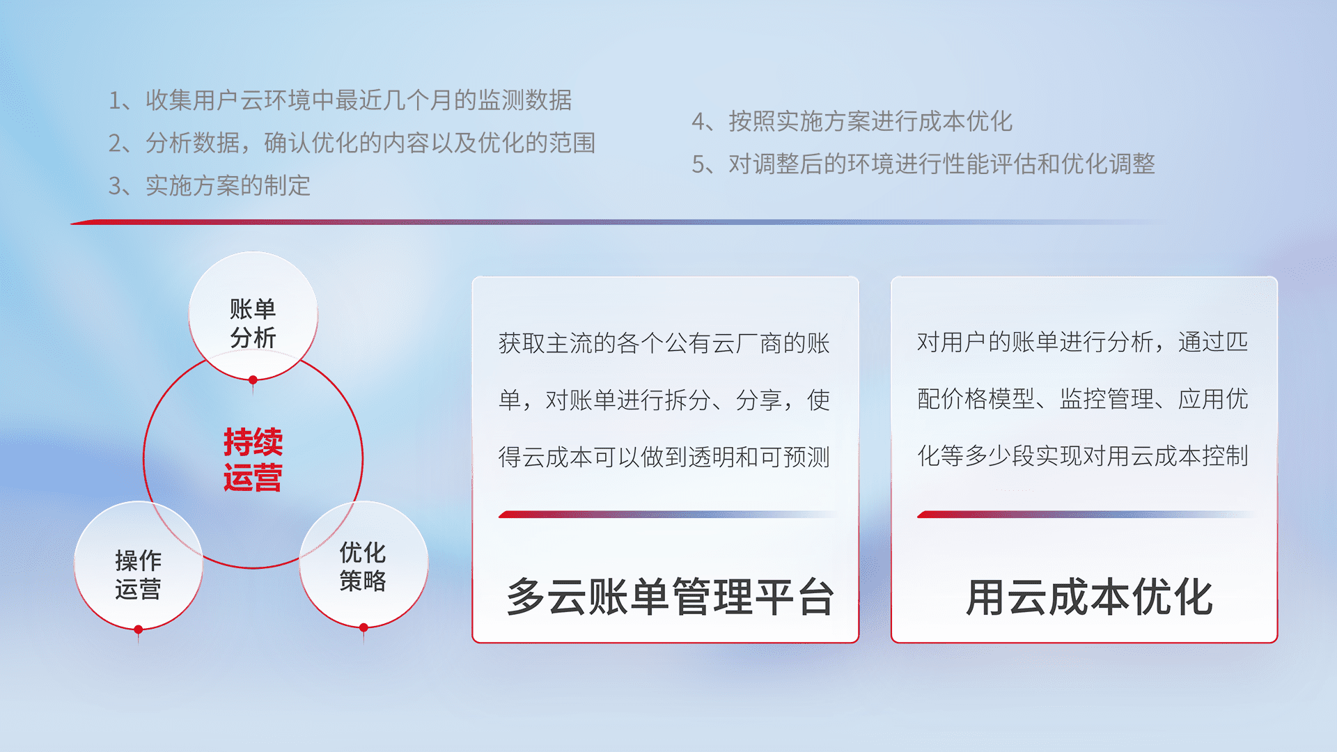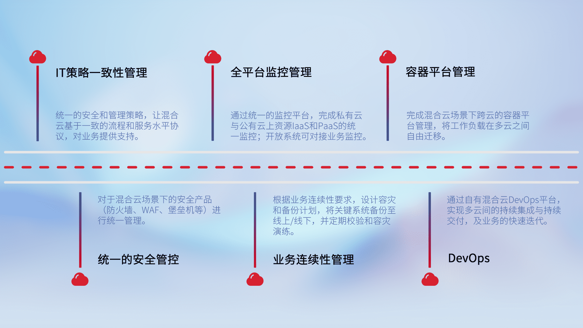 通过多云纳管,,,以统一的资源数据模型把客户的云资源进行抽象和封装,,,,进而实现对多云资源的统一操作,,,保障云资源管理的可靠性、、稳定性与可用性。。。。量身定制化运维内容,,配置、、、开发运维、、、、补丁管理、、、、备份、、、、监控、、、认证和访问管理、、、审计和日常巡检等,,,,保障在用云过程中的可靠度,,稳定度以及高可用率。。。