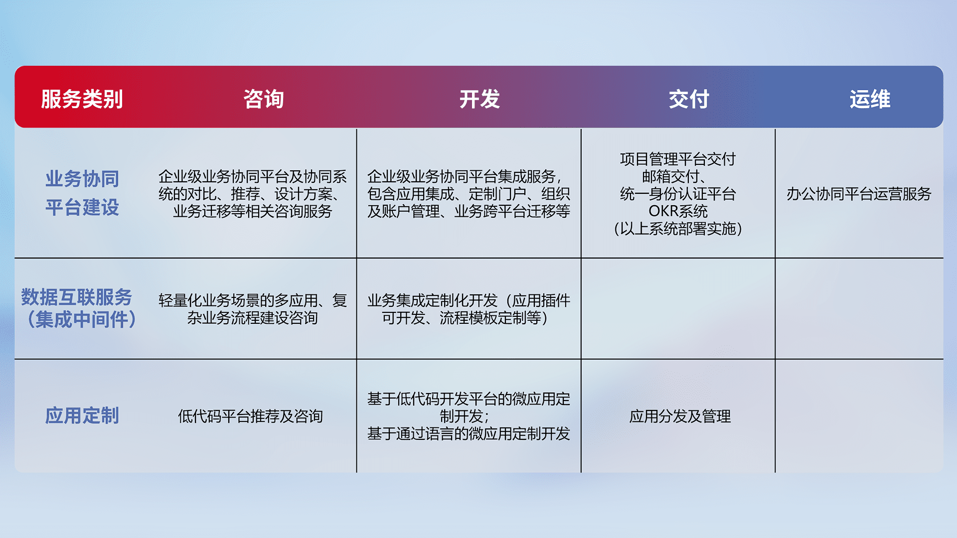 针对钉钉、、、企微、、IDaas等平台级产品提供产品的规划、、方案、、、交付、、定制化开发等服务,,,,实现如统一协同办公、、智能客户服务、、混合会议管理、、智能数据查询、、、等业务场景,,,,实现数字化转型。。